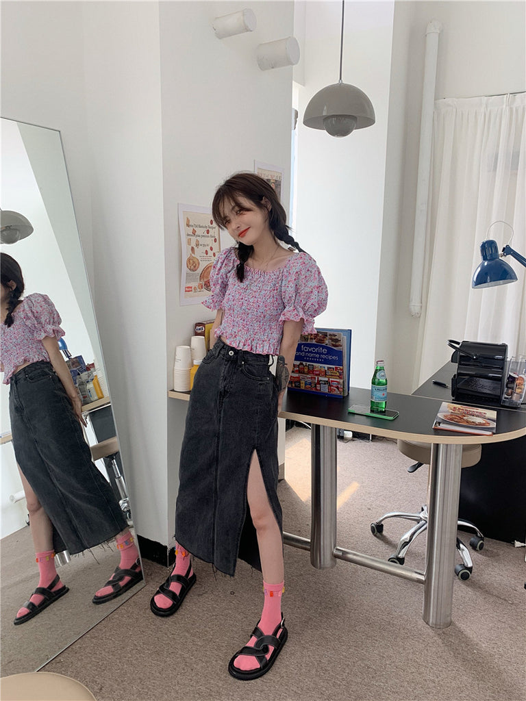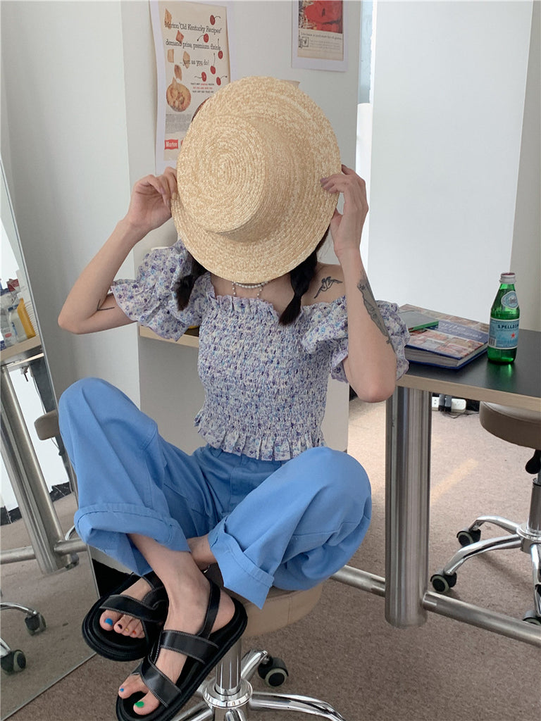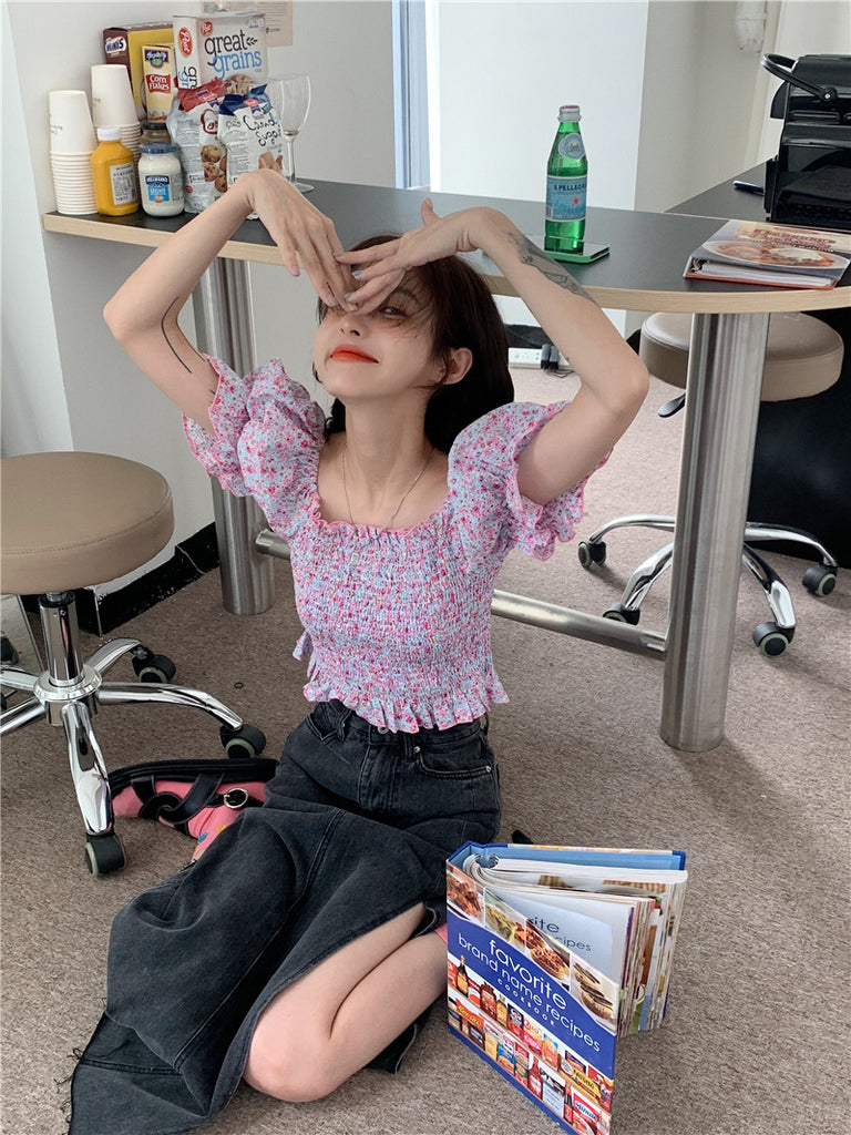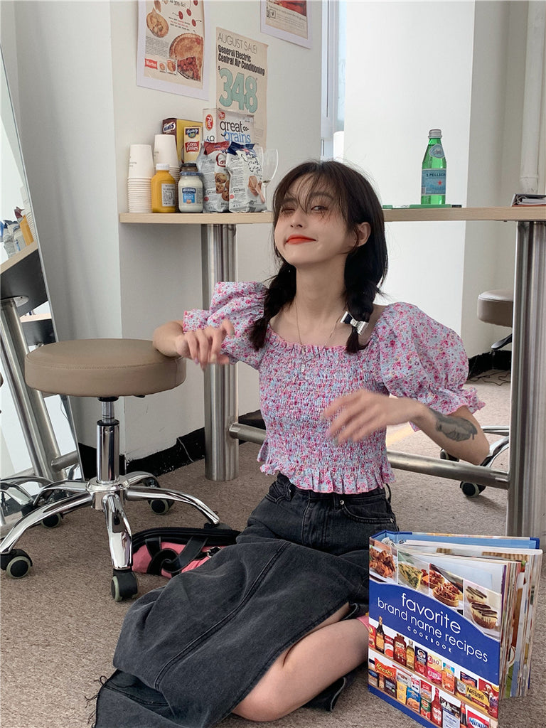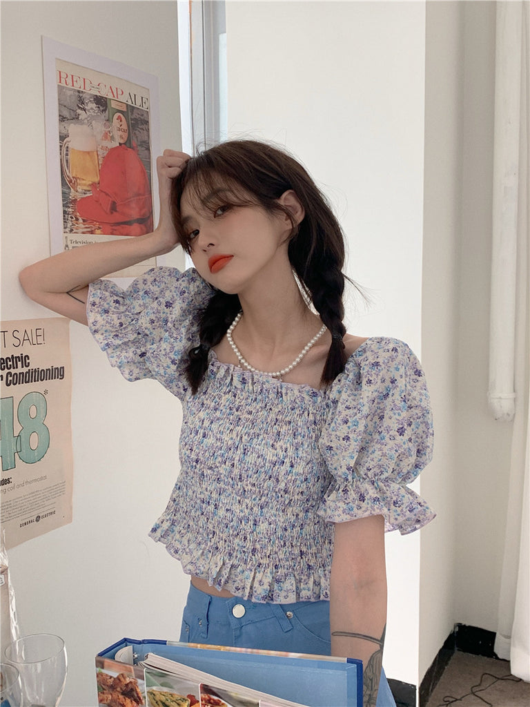 Temperament Sweet Women Smoking Stylish Puff Sleeves Square Neck Smoke Tops Off Shoulder Short Crop Top