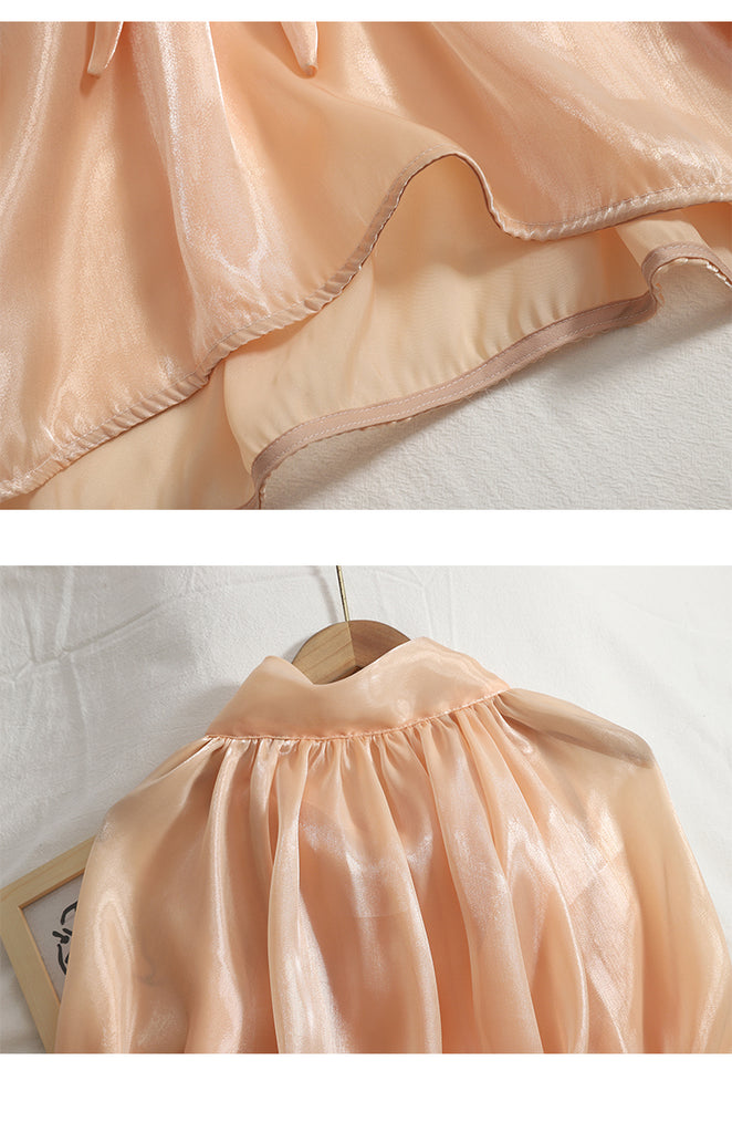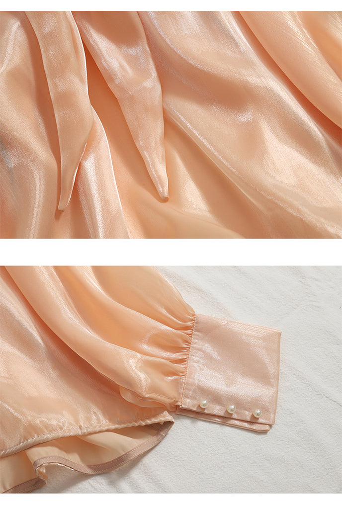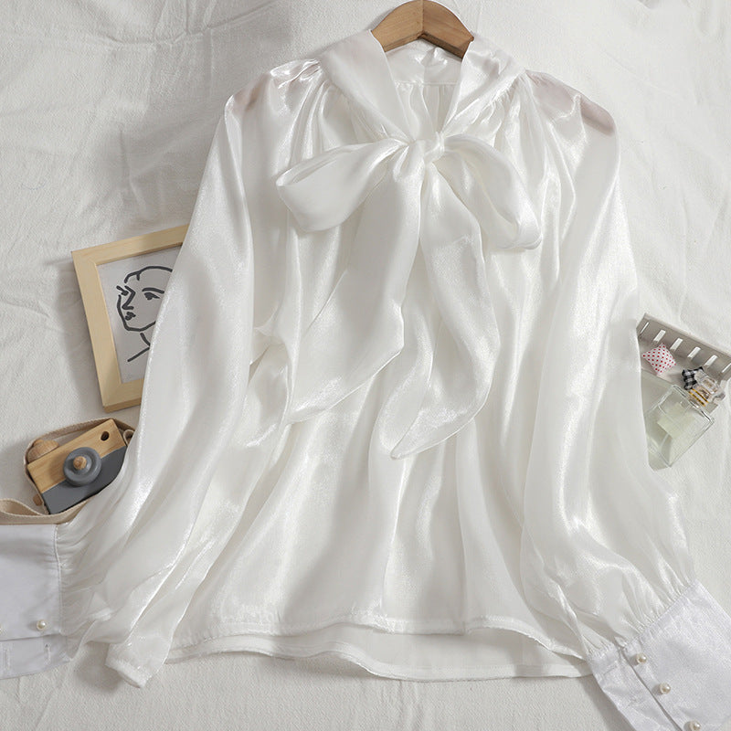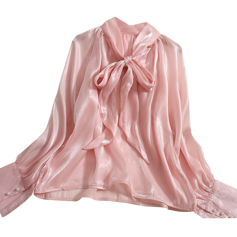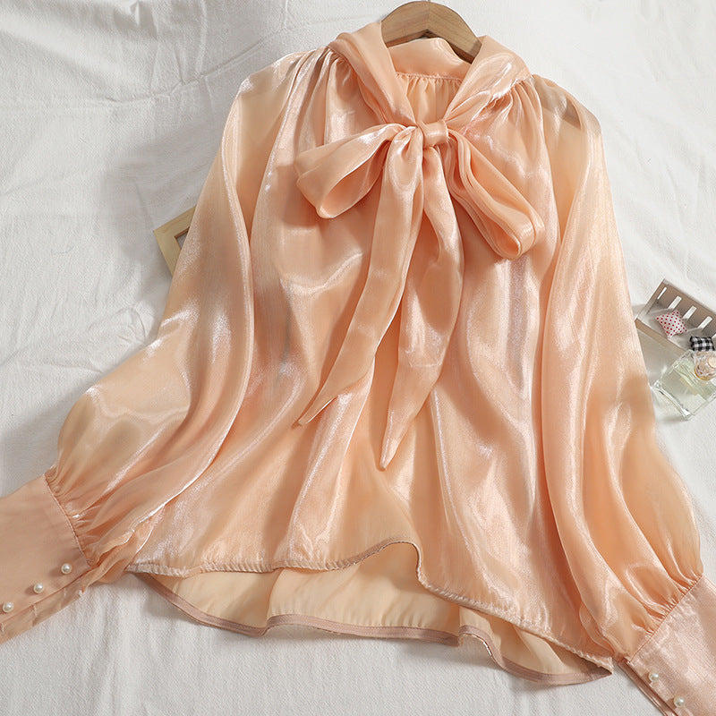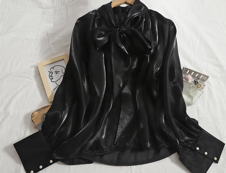 Pattern: Stand Collar, Tie Big Bow, Shiny Solid Color, Long Sleeves Top Shirt