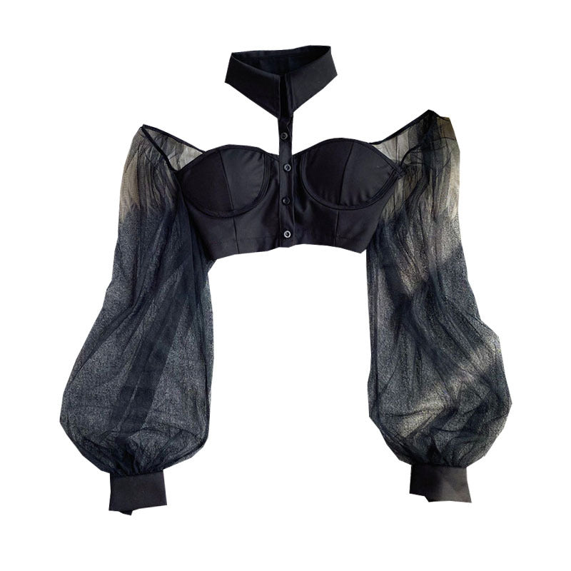 Trend Fashion Sexy Women Black Halter Neck Polo Collar Off Shoulder Puff Long Sleeves Club Party Crop Top Blouse