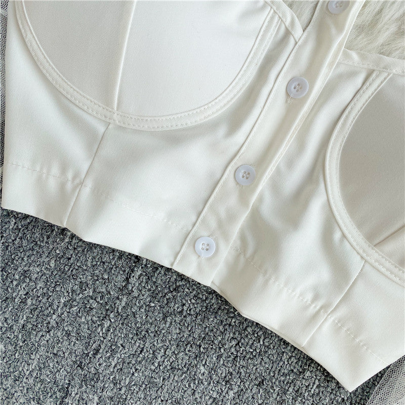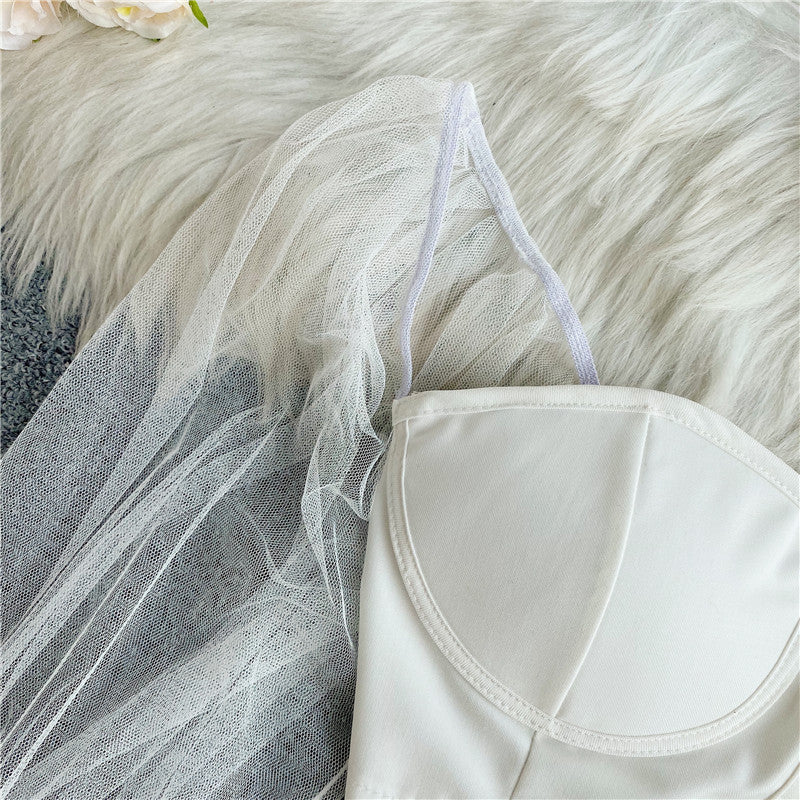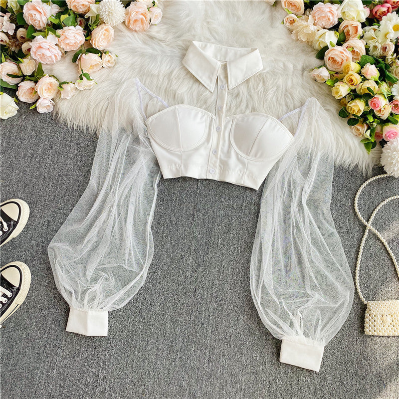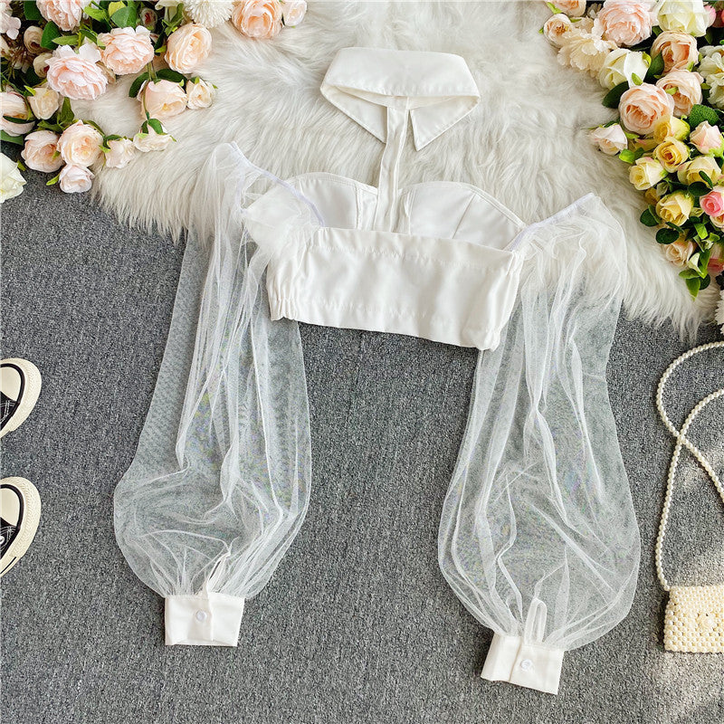 Trend Women White Halter Neck Polo Collar Off Shoulder Puff Long Sleeves Club Party Crop Top Blouse