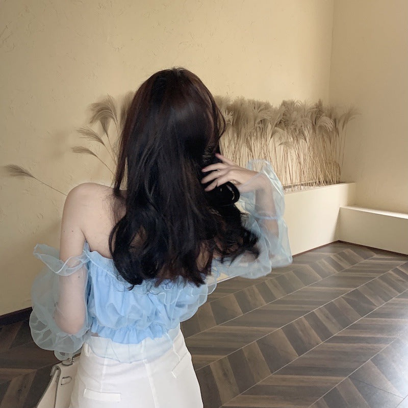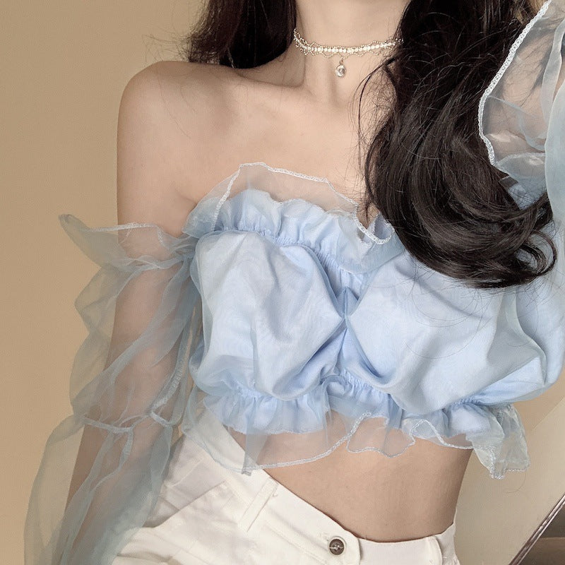 Trendy Sexy Women Puff Ruffled Edge Hem Mesh Trumpet Sleeve Off Shoulder Cropped Tube Top