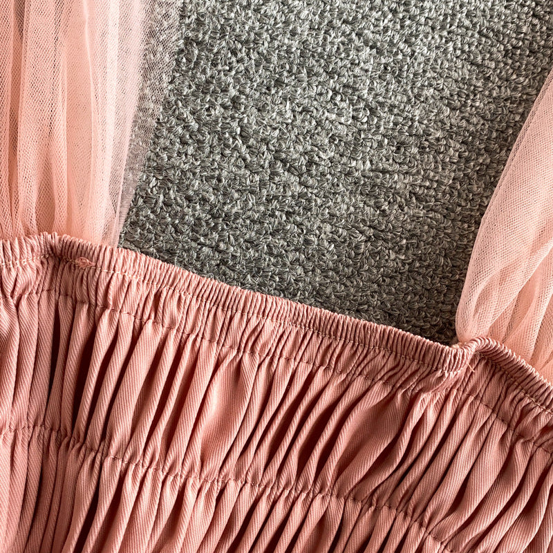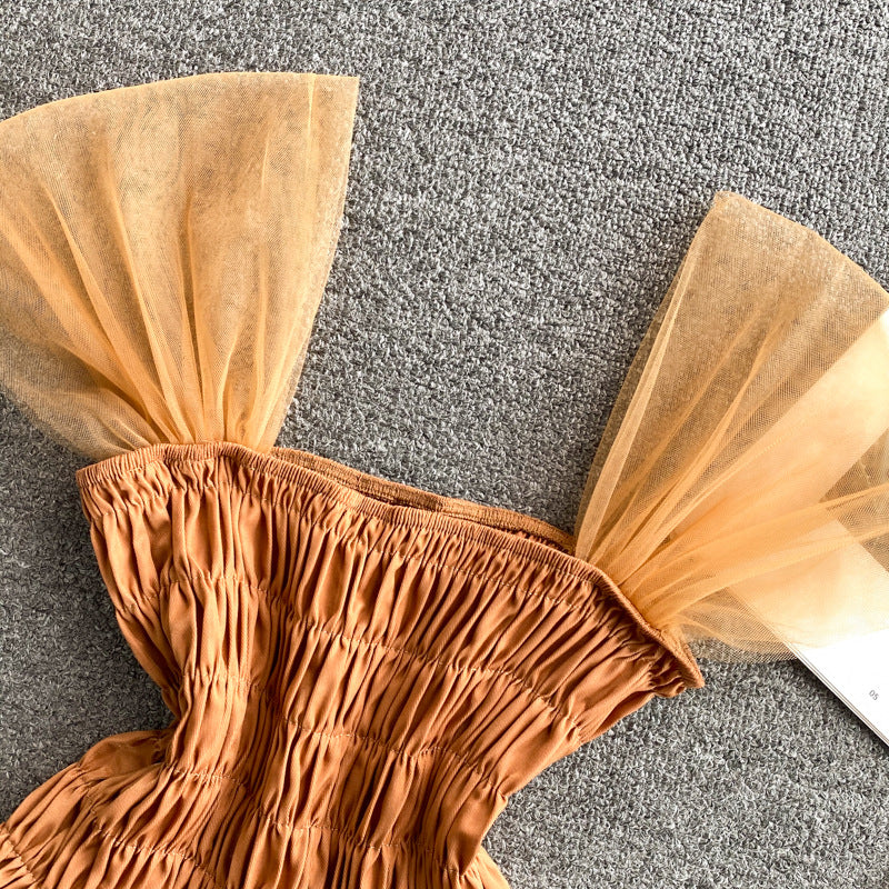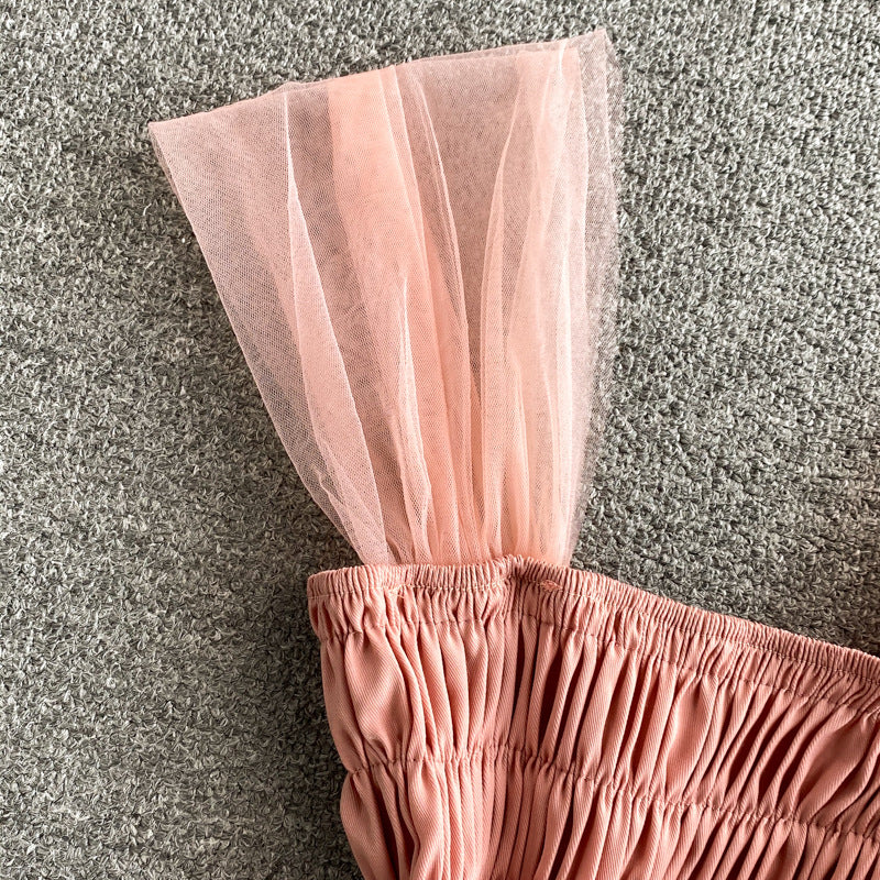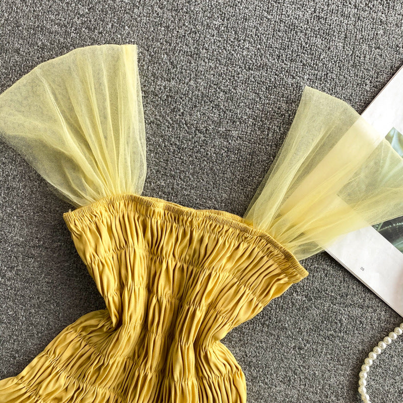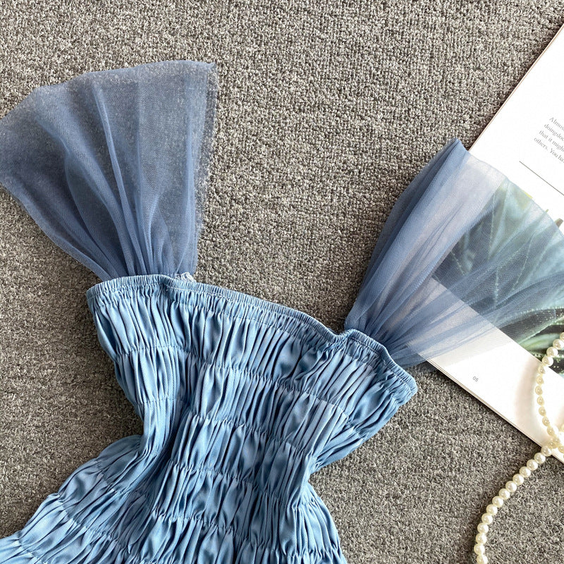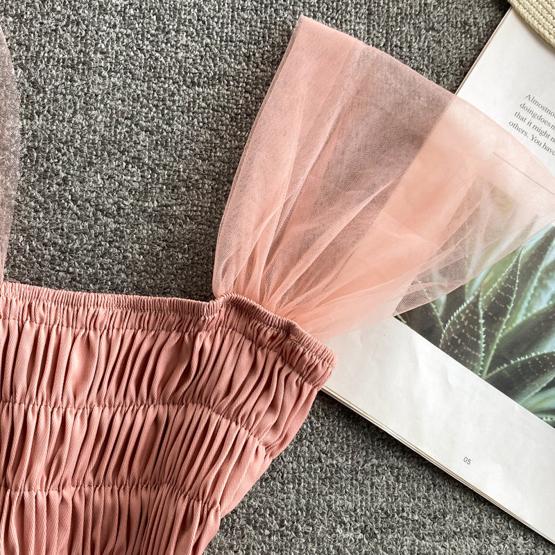 Trendy Style Summer Holiday Women Wrinkled Mesh Stitching Camisole Ruffle Waist Short Top Vest Blouse