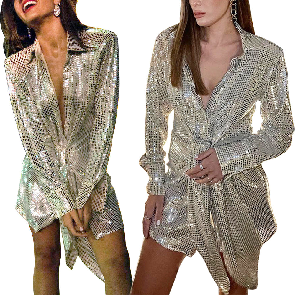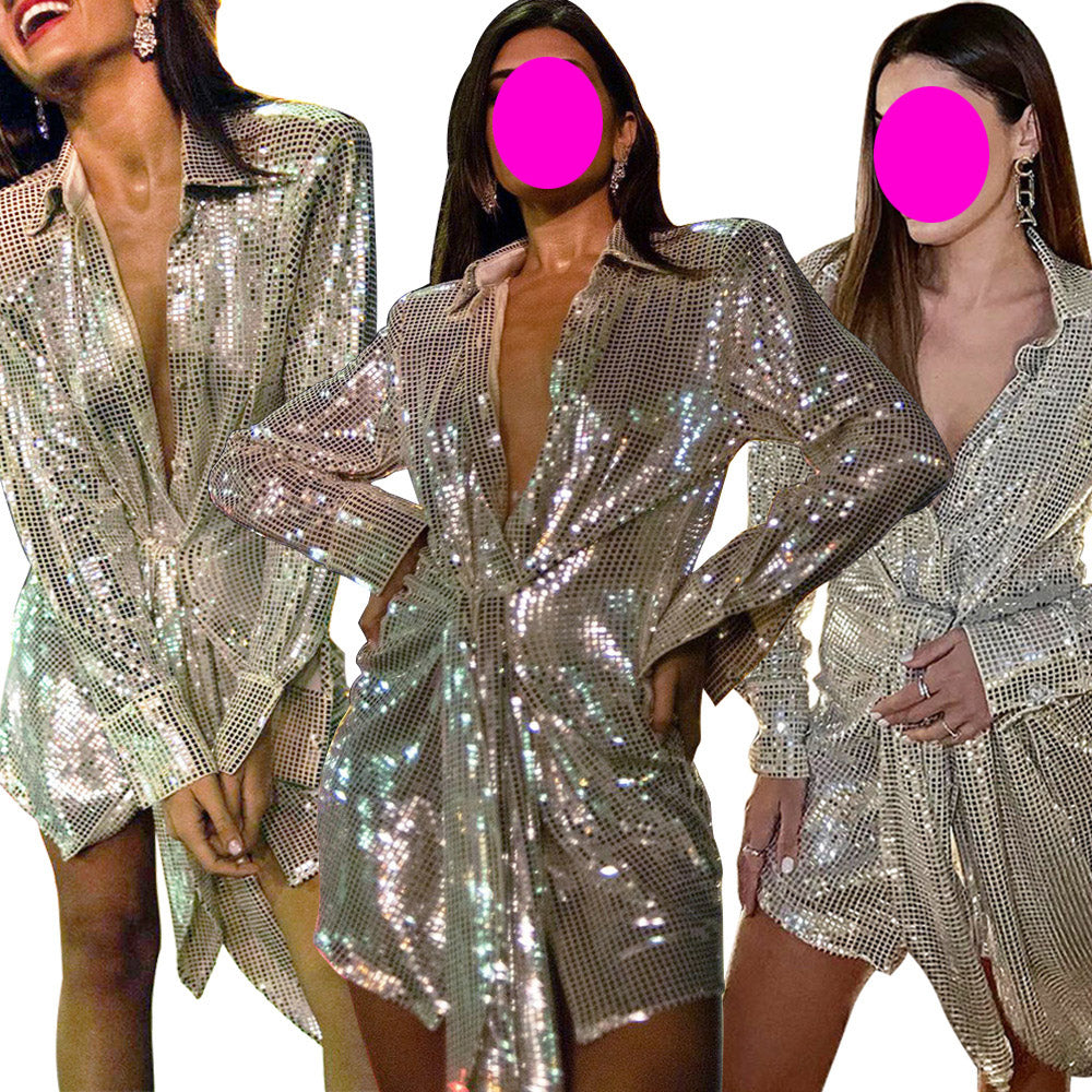 Trendy Women Front Bow Shiny Long Sleeved Sequins High End Deep V Upper Jacket