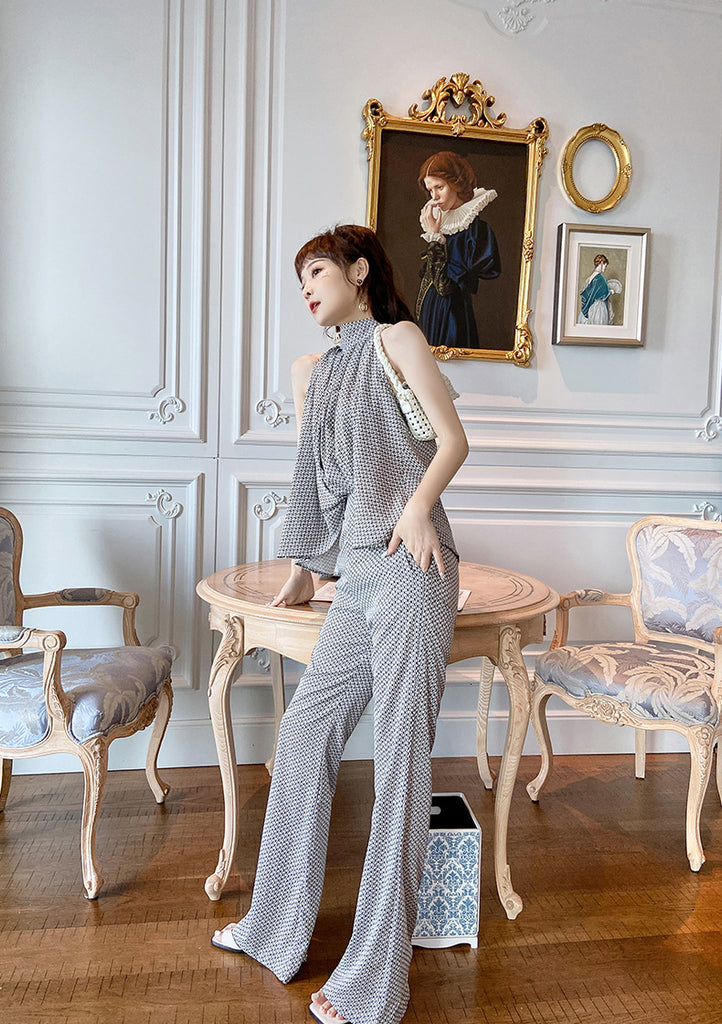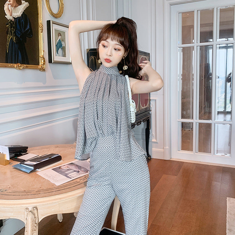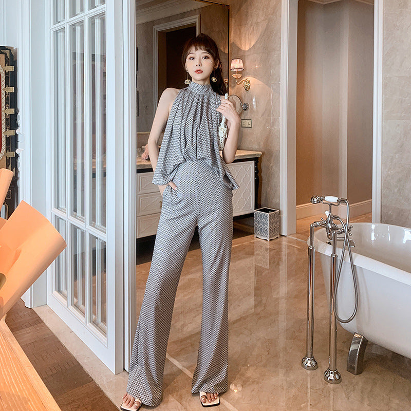 Two Piece Temperament Women Pleated Top Front Leaded Sleeveless Shirt Fit Flared Pants Suit