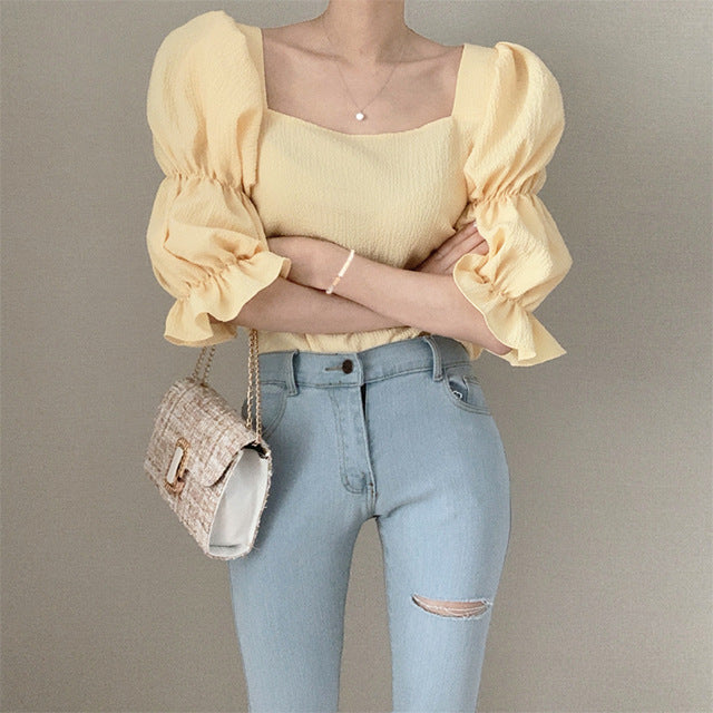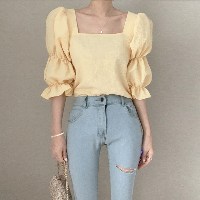 Vintage Sexy Women Pleated Top Smocked Square Neck Collar Puff Sleeve Tops Blouse