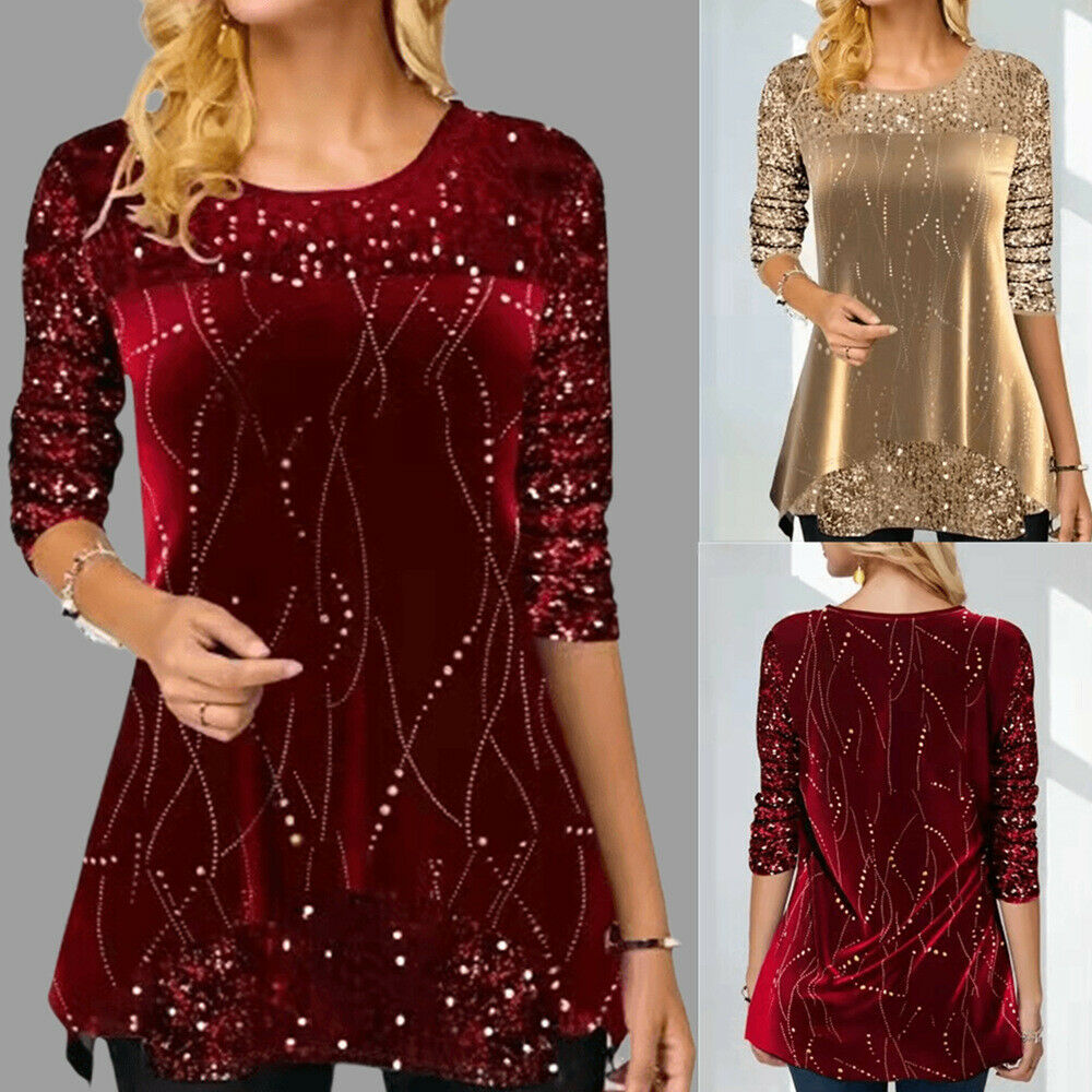 Women Casual Glitter Sequin Round Neck Long Sleeves Asymmetric Blouse Tops